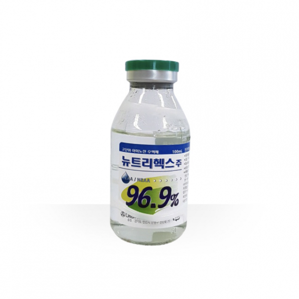 | 원료약품 및 분량 | 100 mL 중 유효성분 L-이소류신0.15g, L-메티오닌0.129g, L-페닐알라닌0.153g, L-트레오닌0.132g, L-트리프토판0.06g, L-발린0.186g, 아르기닌0.36g, 히스티딘0.09g, 알라닌0.45g, L-류신0.222g, 글리신0.42g, L-리신염산염0.2474g, L-프롤린0.45g, 자일리톨3g, D-소르비톨3g, 기타첨가제 L-말산,염화나트륨, 수산화칼륨, 염화칼슘, 염화아연, 염화칼륨, 글리세로인산나트륨수화물, 아세트산나트륨수화물, 염화마그네슘, 주사용수 | ||